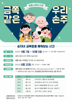 이번 강좌는 세종시 거주 중인 조부모, 예비조부모 누구나 수강 가능하며, 세종시립도서관 누리집과 현장방문신청을 통해 오는 9월 6일까지 선착순 15명을 모집한다.