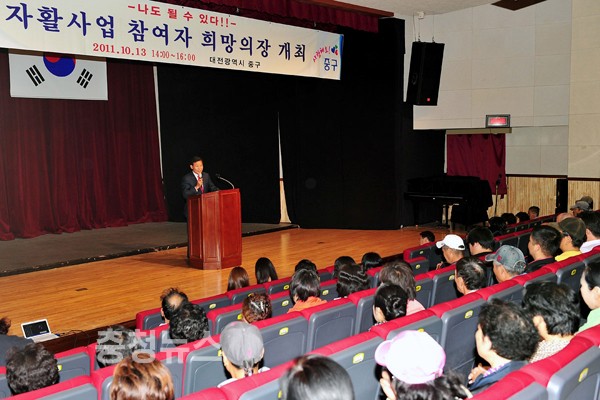 대전 중구(구청장 박용갑)는 13일 자활사업 참여자들이 적극적인 삶을 개척해 나갈 수 있도록 희망을 심어주기 위해 자활근로자 180여 명이 참여한 가운데 종합문화복지관에서 ‘희망의 장’ 교육을 실시했다.