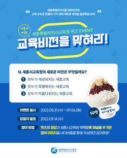 [충청뉴스 최형순 기자] 세종시교육청은 새로운 세종교육 비전을 홍보 및 확산하기 위한 ‘세종교육 비전 맞히기 퀴즈 이벤트’를 실시한다.