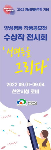 9월 1일부터 4일까지는 한국양성평등교육진흥원이 주최한 양성평등 디자인 공모전의 일반부와 청소년부, 유아부 수상작 40점을 천안시청 로비에서 전시한다. 각 작품은 일상 속 다양하고 참신한 ‘성평등’ 메시지를 담아 시민들의 눈길을 끌 전망이다.