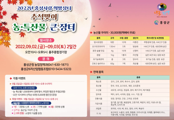 [충청뉴스 김정식 기자] 충남 홍성군이 오는 2일부터 3일까지 ‘추석맞이 농특산물 큰장터’를 개최한다.