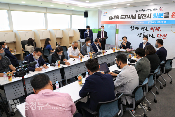 민선8기 시군 방문 10번째로 당진시를 방문한 김 지사는 오 시장 등 시 공직자 환담, 기자간담회와 김덕주 의장 및 시의원과의 면담에 이어 당진홀에서 지역기관‧단체장 및 시민과의 대화 시간을 가졌다.