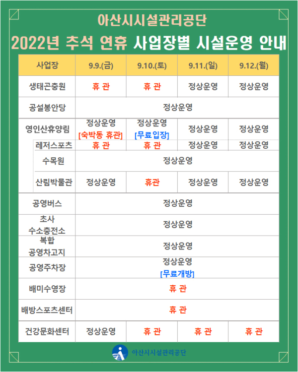 [충청뉴스 박동혁 기자] 아산시시설관리공단(이하 공단)은 추석 명절 연휴에 시민들의 안전한 시설 이용을 위한 ‘추석 명절 운영계획’을 수립했다.