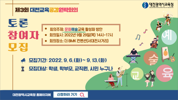 조훈 혁신정책과장은 “학생, 교직원, 시민 등 교육공동체가 문화예술교육 정책을 이해하고, 예술체험 기회 확대와 지역 연계 예술교육 활성화를 위한 다양한 아이디어를 공유할 수 있는 토론의 장이 되길 바란다”고 했다.