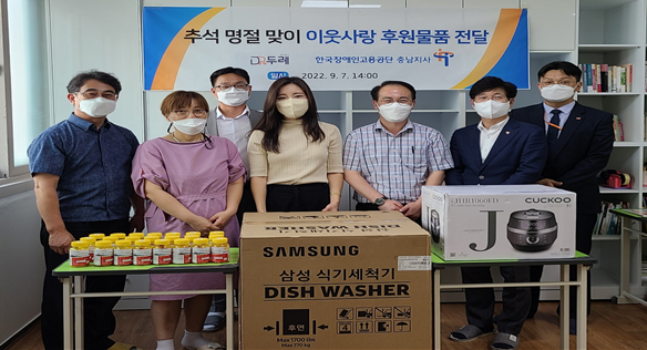 [충청뉴스 박동혁 기자] 한국장애인고용공단 충남지사(이하 공단)는 두레(주)와 함께 추석 명절을 맞이해 사회공헌활동의 일환으로 7일 열린문화지역아동센터에 식기세척기, 건강기능식품 등 기부 물품을 전달했다.