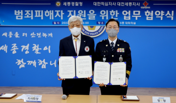 [충청뉴스 최형순 기자] 세종경찰청(청장 손장목)과 대한적십자사 대전세종지사(회장 김선균)는 . 7일 세종경찰청 대회의실에서 범죄 피해자 지원을 위한 업무협약을 체결했다.