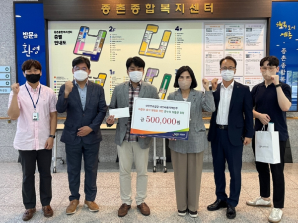 대전세종지역본부 직원들이 직접 세종시 종촌종합복지센터 종합사회복지관, 세종시 건강가정·다문화가족지원센터, 세종시 장애인단체연합회에 방문하여 저소득 취약계층에게 온누리상품권 각 50만원씩 총 150만원을 전달하였다.