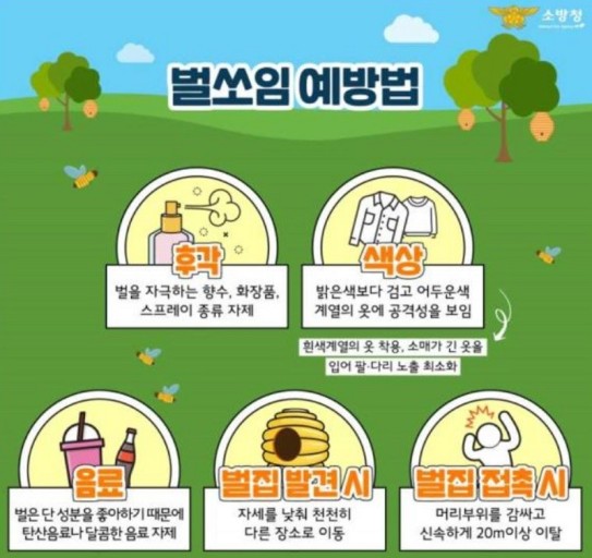 벌 쏘임 사고를 예방하기 위해서는 ▲벌초 시 긴 팔, 긴 바지, 챙이 넓은 모자 등을 착용 ▲밝은색 계열 옷 착용 ▲진한 향이 나는 화장품은 피하고 단맛이 나는 음료 자제 ▲벌이 공격할 때 무리하게 쫓아내지 말고 머리를 감싼 채 신속히 피하기 등이 있다.