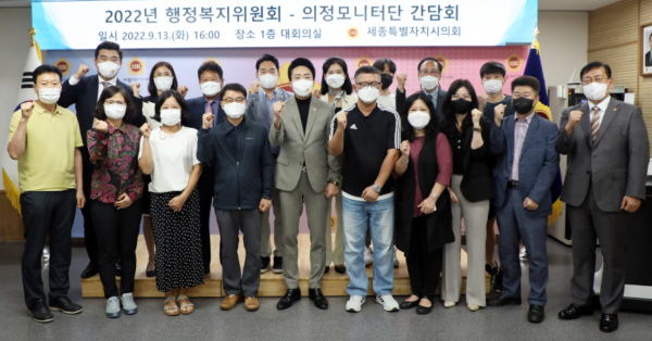 [충청뉴스 최형순 기자] 세종특별자치시의회 행정복지위원회(위원장 임채성)는 13일 대회의실에서 의정모니터단 행정복지분과와 간담회를 열고 모니터단 운영 및 활동 방향에 대해 논의했다.