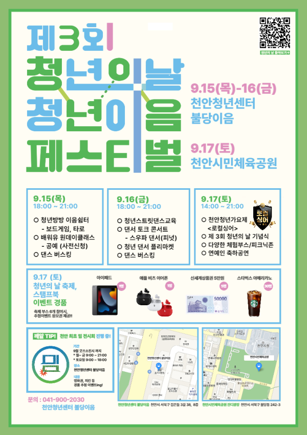 17일에는 천안시민체육공원에서 △청년의 날 기념식 △천안청년가요제 로컬싱어 경연 △MBTI검사, 퍼스널컬러, 캔들‧가죽 공예, 게임부스 등 다양한 체험부스가 운영된다.