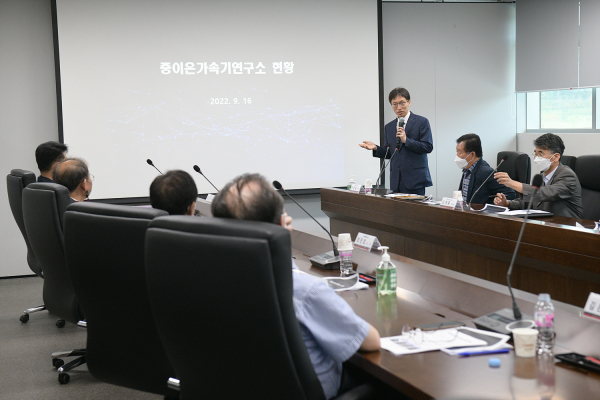 최 시장은 이날 홍승우 중이온가속기 연구소장, 고려대 이긍원 교수 등 관련 전문가들과 만나 중이온가속기 구축사업 추진상황을 듣고, 가속기 시설구역으로 이동해 가속기 장치 및 설비 공간을 시찰했다.
