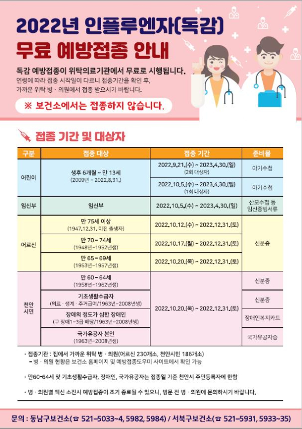 어린이 외 임신부와 만 65세 이상 어르신(1957년생 이전), 천안시민(만 60~64세, 기초생활수급자, 장애의 정도가 심한 장애인, 국가유공자) 등 무료 접종대상자는 혼잡을 피하고 안전한 예방접종을 위해 10월부터 순차적으로 예방접종을 받게 된다.