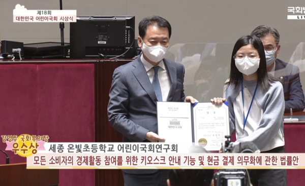 온빛초 어린이국회연구회가 제출한 '모든 소비자의 경제활동 참여를 위한 키오스크 안내 기능 및 현금 결제 의무화에 관한 법률안‘은 부의장상에 해당하는 우수법률안으로 선정됐다.