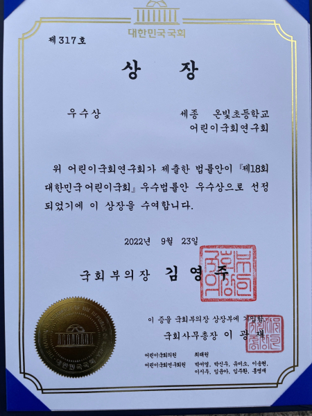 [충청뉴스 최형순 기자] 온빛초등학교(교장 신명희, 이하 온빛초) 어린이국회연구회가 23일 국회의사당에서 열린 ‘제18회 대한민국어린이국회’에서 우수상을 수상했다.