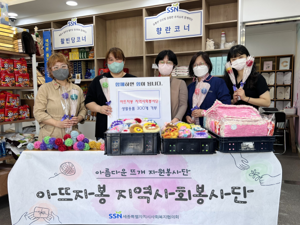 [충청뉴스 최형순 기자] 세종특별자치시사회복지협의회(회장 김부유, 이하 ‘협의회’) 소속 아뜨자봉 지역사회봉사단(단장 송미진)이 29일 사회공헌센터를 방문해 직접 손으로 뜬 생활 소모품 300개를 기부했다.