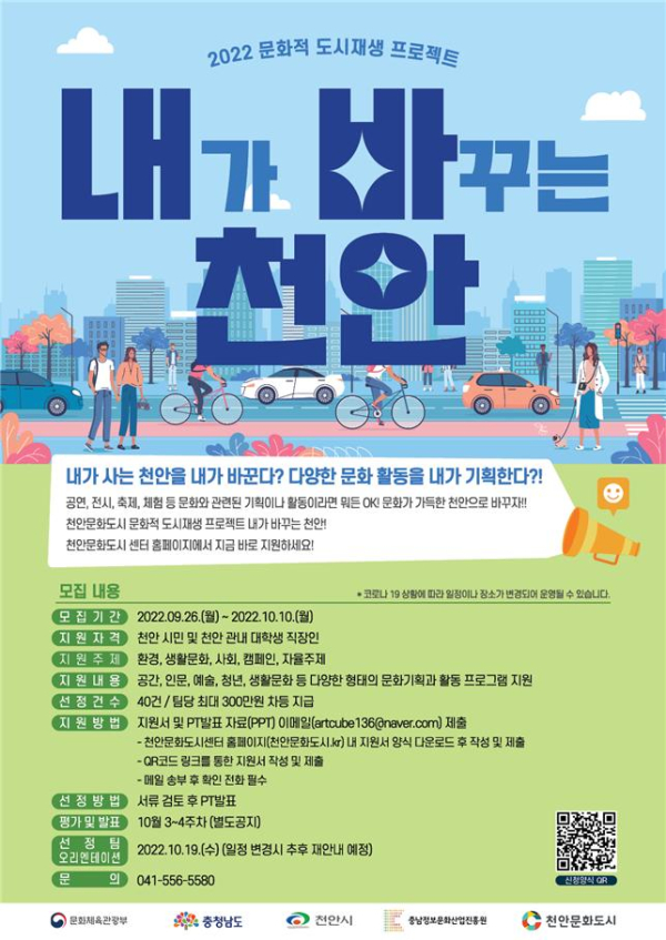 [충청뉴스 박동혁 기자] 충남 천안시와 충남정보문화산업진흥원 문화도시사무국이 천안시민들이 스스로 천안을 문화가 가득한 도시로 만드는 문화적 도시재생 프로젝트 ‘내.바.꾸 천안(내가 바꾸는 천안)’을 모집에 나섰다.
