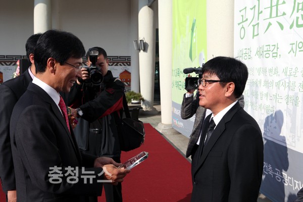 ▲ 안희정 충남도지사가 계룡건설 윤길호 건축본부장에게 대상패를 전달하고 있다.