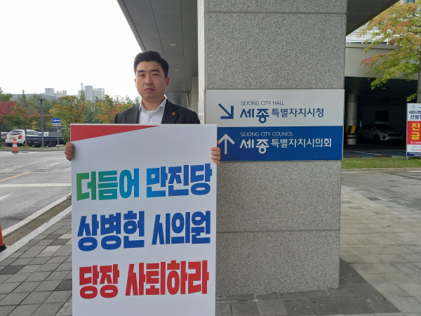 국민의힘 세종시당은 지난 4일부터 류제화 위원장을 시작으로 세종시의회 앞에서 동료 의원 성추행 의혹에 휘말린 상병헌 세종시의회 의장의 사퇴를 촉구하는 1인 시위가 이어가고 있다.