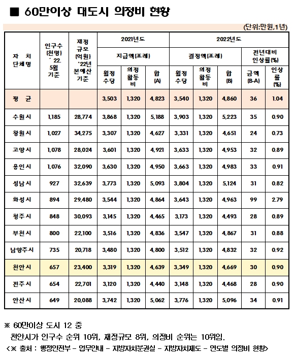 특히, 2014년 한차례 6% 의정비를 인상한 것을 제외하곤 매년 물가 상승분에도 못미치는 0~1%대 인상에 그쳐 사실상 8년간 의정비가 동결돼 60만이상 12 도시 중(1위, 수원시 5,223만원),천안시 10위(4,669만원)라면서 인상의 당위성을 강조하고 있다.