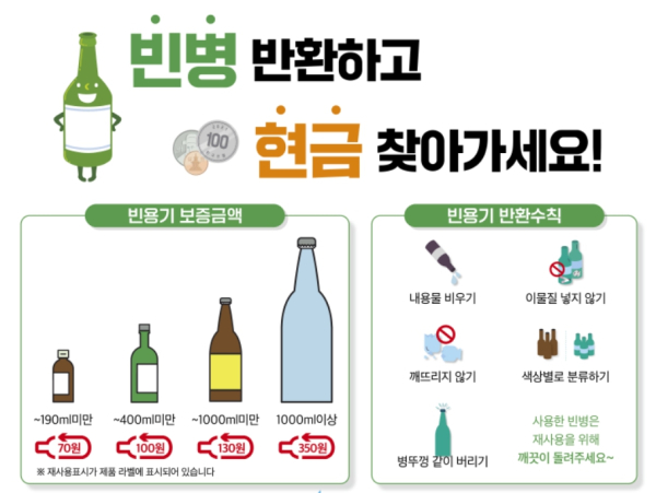 빈 용기는 규격에 따라 2017년 이후 출고·수입 1병 기준 70원에서 최대 350원까지 교환해준다.
