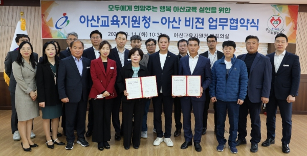 [충청뉴스 박동혁 기자] 충청남도아산교육지원청은 11일 아산교육지원청 대회의실에서 비영리민간단체 아산 비젼과 학교 현장 지원을 위한 업무협약을 체결했다.