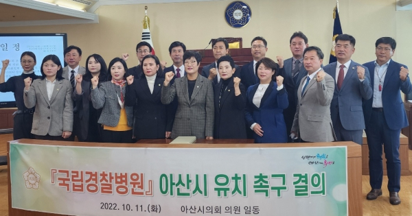 아산시의원 일동은 “37만 아산시민의 의지를 모아 국립경찰병원을 아산시에 반드시 유치할 것을 강력히 촉구한다”며 결의안을 채택했다.