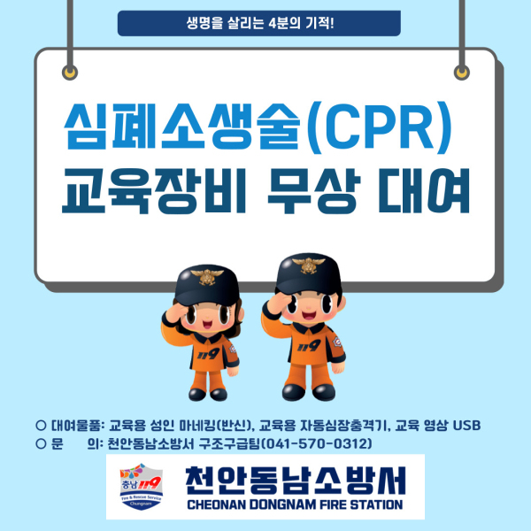 [충청뉴스 박동혁 기자] 천안동남소방서는 심정지 환자 소생률 향상을 위해 심폐소생술 교육장비 대여 서비스를 연중 운영 중이다.