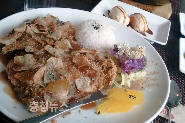 ▲ 무한리필 되는 수제왕돈까스 위에 얹혀진 감자칩이 맛을 한층 더 담백하게 해준다.