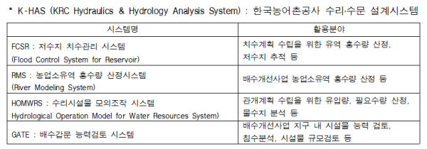 수리수문설계시스템(K-HAS)은 수리 시설 설계에 필요한 수문량 분석 및 수리해석이 가능하도록 공사가 축적한 기술을 전산화한 시스템으로, 2016년부터 설계시스템을 민간에 무료로 제공해 농업 분야 수리수문에 대한 누적 기술이 충분하지 않은 민간의 기술력 증진과 비용 절감에 기여하고 있다.