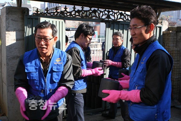 대전도시철도공사 김창환 사장을 비롯한 임직원들이 15일 동구 판암 1동에 거주하는 어려운 이웃 5가구에 '사랑의 연탄'을 배달했다.