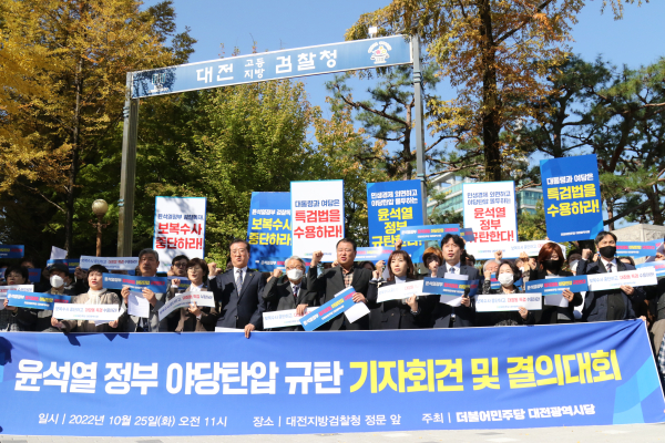 민주당 대전시당 관계자를 비롯한 시·구의원 등 50여 명은 25일 오전 대전지방검찰청 정문 앞에서 기자회견을 열고 “검찰독재와 신공안통치로 민생을 외면하고 야당을 탄압하는 윤석열 정부를 규탄한다”고 밝혔다.