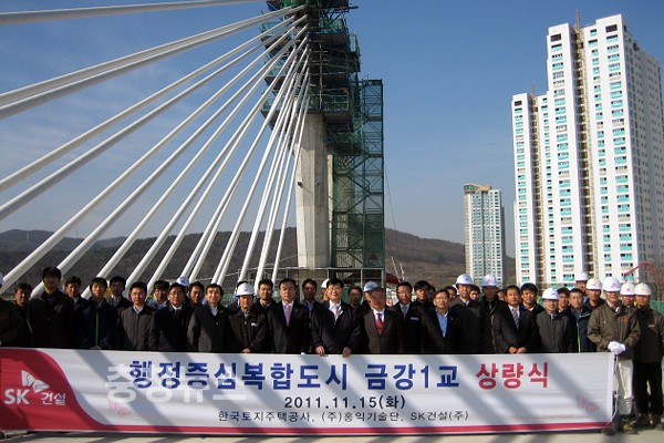 한국토지주택공사 세종시본부는 15일 세종시 랜드마크 교량인 금강1교의 상판 연결구간에서 시공업체 관계자 등 80여명이 참석한 가운데 교량연결식 행사를 가졌다.