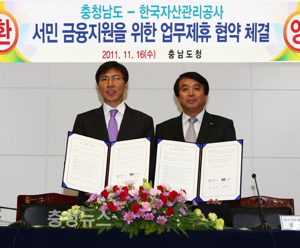 안희정 충남도지사는 16일 도청 소회의실에서 장영철 한국자산관리공사 사장과 '서민 금융지원을 위한 업무제휴 협약(MOU)'을 체결하며, 금융소외자에 대한 신용회복 및 금융지원에 나선다.