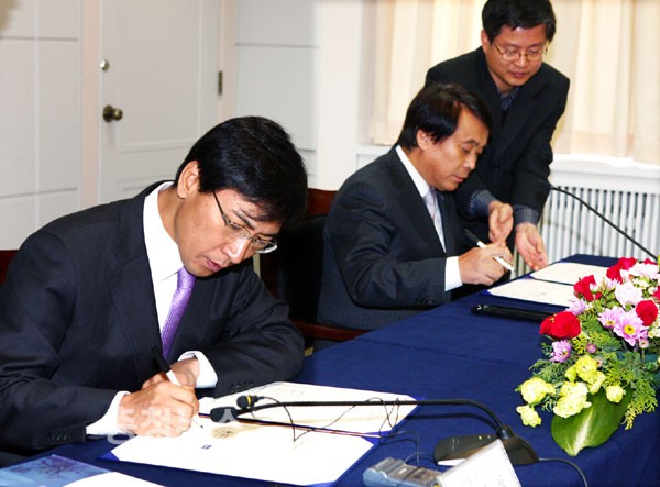 ▲ 안희정 충남도지사와 장영철 한국자산관리공사 사장이 MOU체결에 사인을 하고있다.