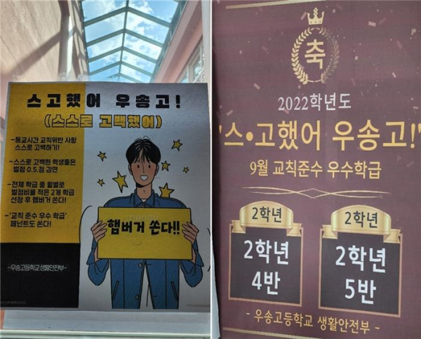 아울러 6월부터는 교칙 준수 캠페인인 ‘스·고했어 우송고(스스로 고백했어, 우송고)’를 진행 중이다. 스스로 교칙 위반 사실에 대해 자진 신고를 한 학생에 대해 벌점을 감면하고 벌점 비율이 가장 적은 우수 학급 2개를 선정해 간식과 페넌트를 주는 행사로, 공동체에 대한 책임 의식 및 실천적 윤리 교육을 통한 민주시민역량을 강화하고자 노력하고 있다.