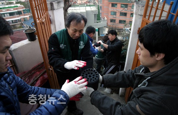 ▲ 황인택 병원장이 조심스레 연탄을 전달하고 있다.