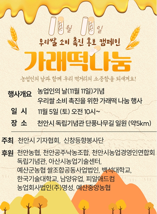 이날 행사는 농업인의 날(11월11일)을 맞아 우리쌀 소비촉진의 일환으로 독립기념관 단풍나무숲길을 찾은 관광객과 시민들을 대상으로 가래떡과 홍보용 쌀 등을 나눠주며, 우리 농산물 애용 캠페인을 벌일 예정이다.
