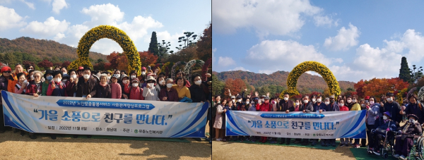 어르신들의 일신상의 안전을 확보하기 위해 국화꽃 축제의 극성수기 일정을 피하여 가을 단풍과 국화꽃의 단아한 아름다움이 멋스럽게 어우러진 청남대에서 진행하였다.