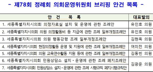 의회운영원회 소관 의원발의 조례안 및 규칙안 7건에 대한 주요 내용은 다음과 같다.