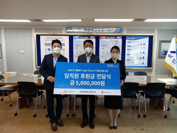 [충청뉴스 박동혁 기자] 충남 아산시는 삼성디스플레이가 지난 11일 지역 위기 아동 지원을 위해 나눔 키오스크로 모은 후원금 500만 원을 전달받았다고 밝혔다.