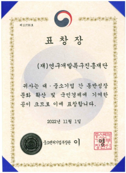 [충청뉴스 이성현 기자] 연구개발특구진흥재단이 15일 대‧중소기업 상생협력 부문 ‘중소벤처기업부 장관 표창’을 수상했다.