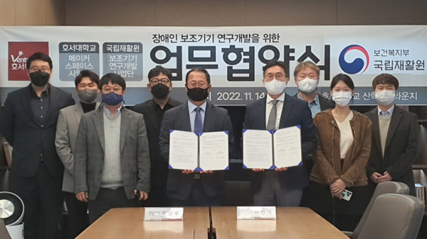 [충청뉴스 박동혁 기자] 호서대학교 메이커스페이스와 보건복지부 국립재활원 보조기기연구개발사업단은 장애인을 위한 보조기기의 발전과 서비스 질을 향상시키기 위해 업무협약을 체결했다.