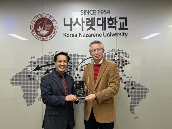 (왼쪽부터)정진태 평생교육원장과 김경수 나사렛대 총장이 기관표창 수상 기념사진을 찍고 있다(나사렛대 제공)