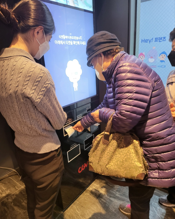 복지관은 1차 키오스크 교육을 마친 20여 명의 어르신들에게 CGV 천안시청점에서 키오스크로 직접 영화티켓과 간식을 구매해 볼 수 있도록 현장교육을 진행했다.