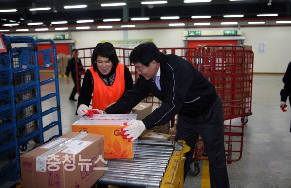 ▲ 장석구 충청우정청장이 소통요원들과 함께 소포 등을 구분하고 있다.