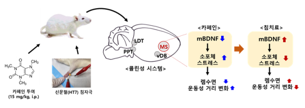 실험을 통해 △수면에 영향을 주는 뇌 내 시스템의 소포체 스트레스 완화 △수면 및 각성 패턴 변화(카페인 투여군과 침치료군 간 각성시간 1.5배 차이 등) △운동성 회복 등의 결과를 확인했다.