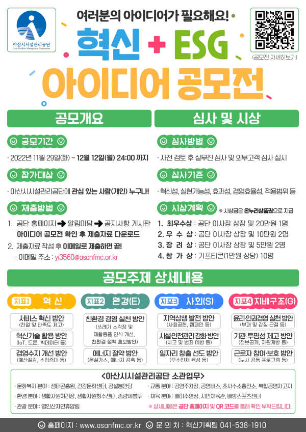 [충청뉴스 박동혁 기자] 아산시시설관리공단(이하 공단)은 내·외부 고객들의 창의적이고 실효성 있는 아이디어를 수렴해 수요자 중심 혁신 및 ESG 경영을 추진하고자 ‘혁신+ESG 아이디어 공모전’을 개최한다고 30일 밝혔다.