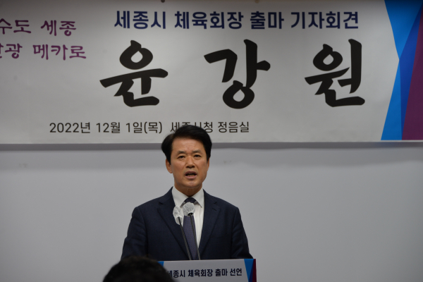 [충청뉴스 최형순 기자] 윤강원 세종시육상연맹회장 세종시체육회 부회장이 1일 시청 브리핑룸에서 기자회견을 갖고 "제3대 체육회장 선거에 입후보 하고자 한다"고 밝혔다.