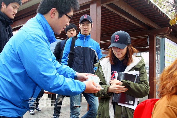 한남대학교 제27대 총학생회가 기말고사 치루기에 분주해 아침을 거르고 등교하는 학우들을 응원하고자 8일 ‘아침 나눔’ 행사로 빵과 우유를 각각 1천개씩 무료로 나눠줬다.