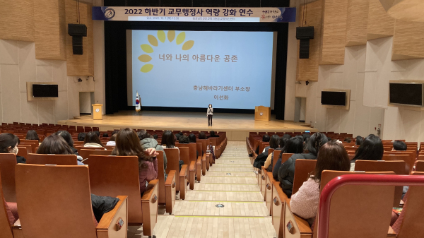 지난 5월에 이어 진행된 이번 연수는 성인지 감수성을 함양해 건강한 공직문화를 조성하기 위한 ‘너와 나의 아름다운 공존’, 인문학 프로그램을 통해 교무행정사의 심리적·정서적 소진을 예방하기 위한 ‘조선의 멸망, 링컨 커피의 나비효과’ 강의로 구성됐다.
